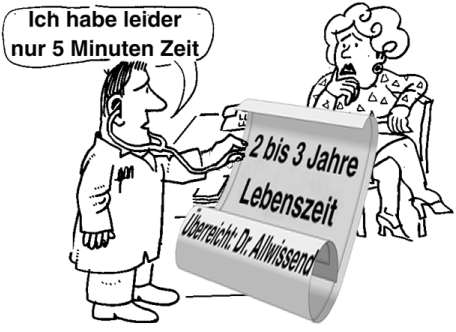 sich. (Klientin beruhigt sich) Kl: (weint) Ich seh meine Metastasen nicht als Feinde, sondern als Botschafter, die mir etwas sagen wollen. Ich unterhalte mich mit ihnen, denn sie wollen mir alle sagen, daß ich leben soll. Und ich habe die Botschaft verstanden. Th: Und sag ihm jetzt auch sowas wie - Der Schock, den Sie mir gemacht haben, indem Sie mir nur noch 2 - 3 Jahre zu leben gegeben haben, der steht dem entgegen. Deshalb wäre es wichtig, daß er diese Botschaft zurücknimmt. So nach dem Motto - Ich weiß es nicht. Weil er weiß es wirklich nicht. Kl: (weint) Als Sie mir eben gesagt haben, daß ich nur noch 2-3 Jahre zu leben habe, das war wie ein Schock für mich. Damit nehmen Sie mir ja jede Hoffnung, daß ich weiterleben werde. Und ich will weiterleben. Th: Ja, und diese Botschaft wirkt im Unterbewußtsein. Diese Aussage muß er zurücknehmen. Kl: (weint) Diese Aussage von Ihnen zerstört in mir alles. Das ist wie eine Bestimmung. Mein Unterbewußtsein hat das aufgenommen und meint, ich habe nur noch 2-3 Jahre zu leben. Nehmen Sie das bitte auf der Stelle zurück und geben Sie mir die Hoffnung, daß ich weiterleben werde, daß ich es schaffen werde. Th: Weil du machst ja auch was. Wenn du nichts machen würdest, hättest du vielleicht wirklich nur noch 2-3 Jahre. Aber du guckst nach in dir, du beschäftigst dich mit dir und dementsprechend hast du eine ganz riesengroße Chance. Kl: (weint) Denn ich beschäftige mich ja mit der Krankheit und ich setze mich mit ihr auseinander und ich mobilisiere damit meine Lebensenergie und die wird mir helfen, meine Krankheit zu überwinden. Es sind schon so viele Krebskranke geheilt worden durch ihren Glauben und dadurch, daß sie sich mit ihrer Krankheit auseinandergesetzt haben. (weint) Ich will ja an mir arbeiten. Ich will mich ja nicht ins Kämmerchen setzen und sagen, so nun sterbe ich. Das kommt für mich ja gar nicht in Frage. Schauen Sie sich doch die Patienten an, die zu Ihnen kommen. Die werden von oben bis unten bestrahlt, die werden bombadiert und glauben, nur durch die Bestrahlung werden sie geheilt und machen innerlich gar nichts Aktives für sich. Ich gehöre nicht zu diesen Menschen. Ich habe einen anderen Weg beschritten, der meinen Körper nicht kaputt macht, durch Chemotherapie und Bestrahlung. Ich gehe den sanften Weg und helfe meinem Körper, seine Lebensenergie zurückzufinden, mein Immunsystem aufzubauen. Was haben Sie sich denn um mein Immunsystem gekümmert? Überhaupt nicht, überhaupt nicht. Sie haben noch nicht mal gefragt. Nein, Sie mit ihrer Engstirnigkeit, Sie sehen nur ihre Bestrahlungsbomben. Und Sie meinen, damit könnten Sie den Krebs besiegen. Aber Sie können den Krebs damit nicht besiegen, sondern Sie machen die Menschen und ihr Immunsystem damit kaputt dadurch. Alles andere ist Ihnen ja egal. ... Er ist jetzt sehr betroffen, er ist sogar äußerst betroffen. ... Ich bitte Sie, ihren Satz zurückzunehmen, daß ich nur noch 2-3 Jahre zu leben habe, denn Sie wissen, es gibt immer wieder Wunder. Und ich hoffe,daß ich auch dieses Wunder erleben werde und ich glaube ganz fest daran. Und darum bitte ich Sie, diesen Satz meiner Lebensbeschränkung zurückzunehmen. ... Ja, er entschuldigt sich, nimmt es zurück und sagt, er hat nicht gewußt, daß es mich so tief getroffen hat. Er sagt, ja wir haben Statistiken. (wütend) Statistiken! Statistiken! Ein Mensch ist aber keine Statistik. Eine Statistik ist der Superlativ einer Lüge. Th: In so einer Statistik sind überwiegend Menschen, die nichts mehr machen, die einfach alles geschehen lassen. Da mag das so ziemlich zutreffen. Aber der Simonton hat in Amerika vor 15 Jahren schon bewiesen - der hat da eine eigene Krebsklinik - daß man nur mit Visualisierungen die Lebenszeit verlängern kann. Und der hat realtiv einfach gearbeitet, also nur die Leute sich vorstellen lassen, daß das Immunsystem kämpft und stark ist. Und du verschiebst oder überdeckst ncht mal nur deine eigenen Bilder, sondern du bearbeitest sie sogar. Sag’ ihm das jetzt Kl: Sie wissen jetzt, welchen Weg ich eingeschlagen habe, daß ich ganz tief im Inneren mich mit der Krankheit auseinandersetze und herausbekommen will, wo meine seelischen Blockaden sind, die mich daran hindern, meine Krankheit zu überwinden. Und wenn ich diese Blockaden gelöst habe, dann fließt wieder meine Lebensenergie, mein Immunsystem wird gestärkt, das am Boden ist. Und das hilft mir. Können Sie das denn nicht verstehen, daß es auch noch andere Wege gibt außer ihren schulmedizinischen engstirnigen Vorschriften? Wenn Sie jetzt wissen, wie ich arbeite, können Sie mir da nicht eine positivere Prognose geben? ... Er sagt, er ist erschüttert, daß er mich so getroffen hat. Er sagt, es fällt ihm zwar immer noch schwer, von seiner schulmedizinischen Richtung abzukommen, aber auch dort gibt es sogenannte Remissionen. Anders kann es die Schulmedizin nicht beschreiben, weil sie irgendwie gebunden ist an das ganze System. Und er wünscht mir von Herzen, daß ich es schaffen werde. Th: Toll, er muß ja nicht dran glauben, aber er muß dir wenigstens die Möglichkeit offen lassen. Jetzt spür mal in dich rein, wie es sich anfühlt und schau mal, was dein Mann dazu sagt. Kl: Mein Mann drückt mich ganz fest an sich und strahlt mich