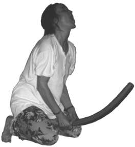schlägt mit dem Dhyando (Plastikschlagstock) auf den Boden und die